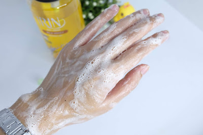 เนื้อเจลอาบน้ำเค้าเป็นสีเหลืองสว่างใสเหมือนสีน้ำผึ้งค่ะ มีกลิ่นหอมอ่อนๆ ของน้ำผึ้งและเกลือค่ะ