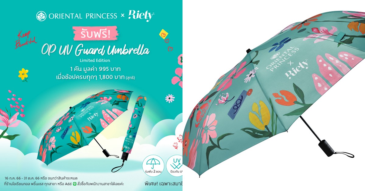 ร่มกันยูวีลวดลายพิเศษที่ Oriental Princess จับมือกับ Riety ดีไซน์เนอร์ชื่อดังผ่านลวดลายของร่มที่ถูกออกแบบได้แรงบันดาลใจมาจากดอกไม้นานาพรรณ อบอวลไปด้วยความสดใสของมวลดอกไม้ตามสไตล์ Oriental Princess
