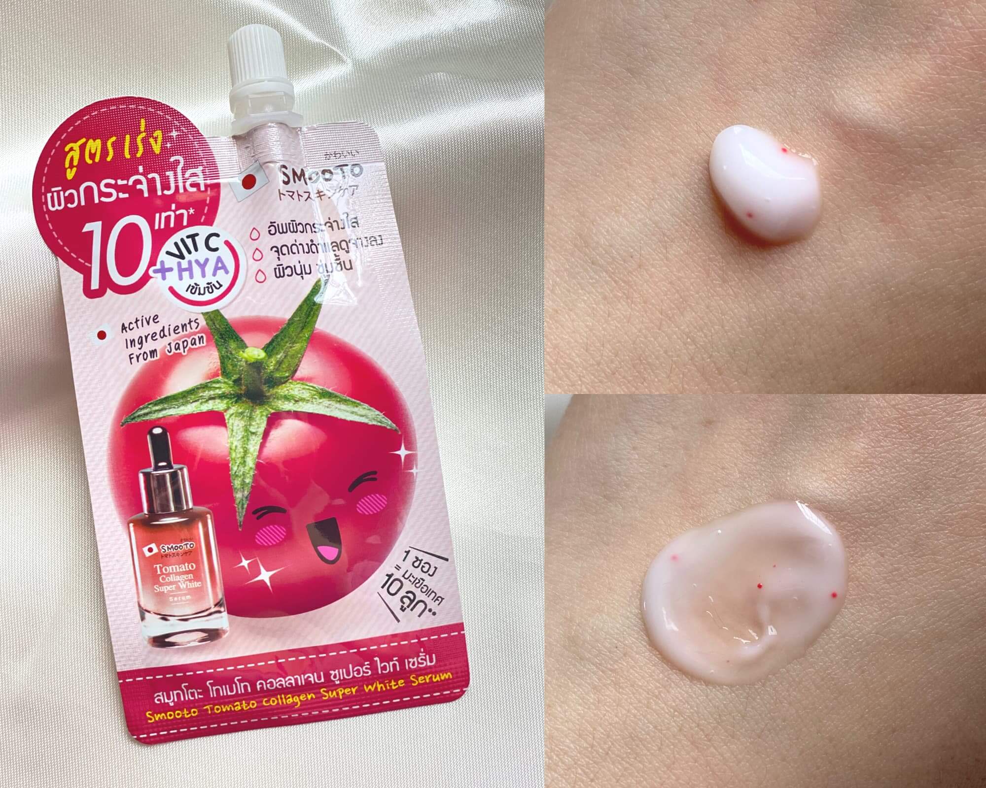 สมูทโตะเซรั่มมะเขือเทศ ใหม่ล่าสุด ที่เพิ่มวิตามินซีเข้มข้นจากมะเขือเทศญี่ปุ่น 10 ลูกไว้ในซองเดียว! เป็นสูตรที่ช่วยเพิ่มความกระจ่างใส บำรุงผิวคล้ำเสียสะสม และมีส่วนผสมของไฮยาลูรอนิค แอซิด, วิตามิน ซี, คอลลาเจน, อาร์บูติน, กลูต้าไธโอน มอบผิวเปล่งปลั่ง ดูมีออร่า รู้สึกเนียนนุ่ม ชุ่มชื้น แลดูสุขภาพดี ทาได้ทั้งเช้า-เย็นเลยนะ