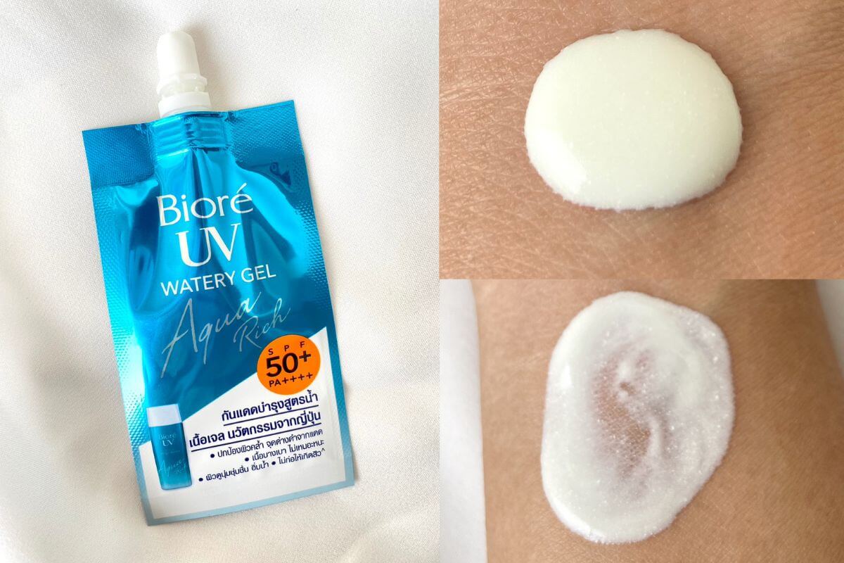 ครีมกันแดดเนื้อเจลเอสเซนส์ ตอนทาให้ฟีลเหมือนมีน้ำกระจายตัวทั่วผิว เกลี่ยง่าย ซึมไว ไม่เหนอะหนะ ทาทับเมคอัพได้