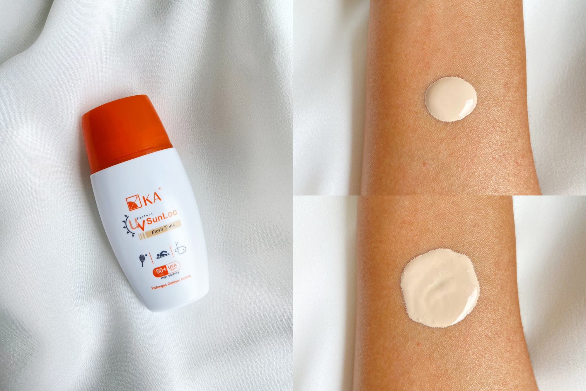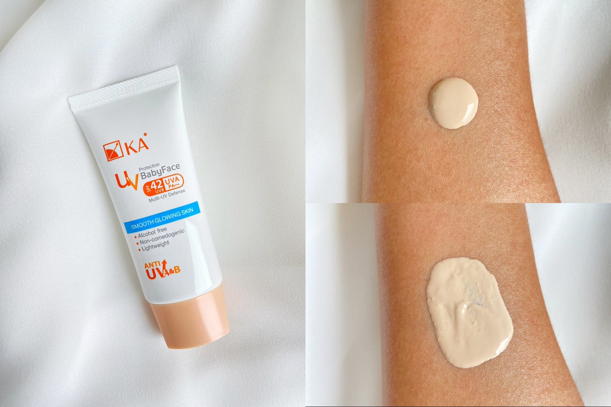 กันแดด KA ผิวแพ้ง่าย เป็นกันแดดหน้าเนียนที่ใช้แทนรองพื้นหรือบีบีครีมได้เลย เพราะเค้ามีเนื้อสีเบจ ช่วยให้เมคอัพติดทนนานขึ้น แต่ไม่มีปัญหาเรื่องทำให้ผิวอุดตัน ให้ผิวดูเนียนเป็นธรรมชาติ และกันแดดได้ทั้งรังสี UVB และ UVA