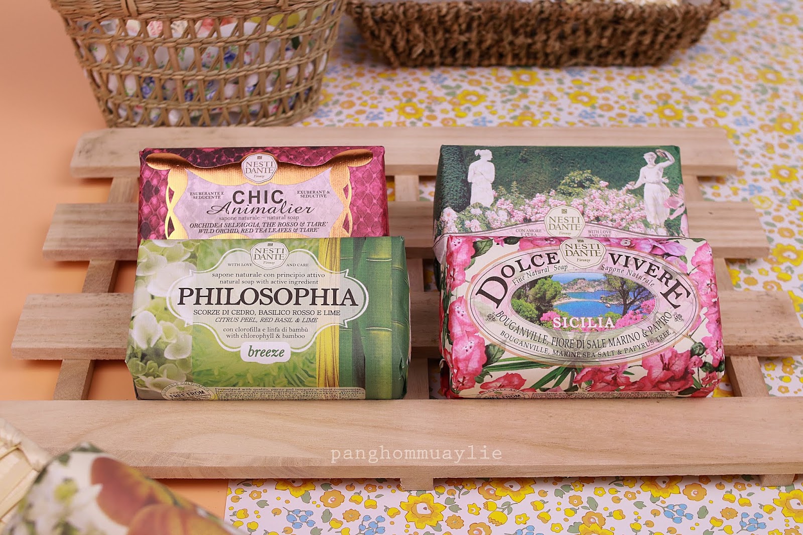 - Nesti Dante Philosophia Breeze Soap : สูตรนี้จะดูคลีนๆหน่อย เป็นสารสกัดจากคลอโรฟิลล์ของต้นไผ่และใบโหระพาแดง สูตรนี้ช่วยDetoxสารพิษออกจากผิวไป เช่น พวกแบคทีเรียต่างๆ หรือไม่ก็อาการผดผื่น ผิวอักเสบ ผิวแพ้ ผิวเห่อ สูตรนี้จะทำให้ผิวสะอาดมากขึ้น ผ่อนคลายมากขึ้น